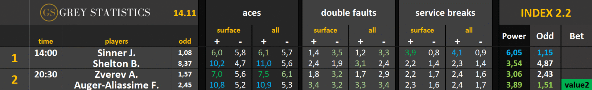 Zapraszamy na codzienną dawkę statystyk dotyczących asów serwisowych, podwójnych błędów i przełamań w spotkaniach ATP & WTA Tour autorstwa Grey Statistics. W tabelach znajdziecie średnie liczby z sezonu, które mogą pomóc w analizie i doborze typów na dany mecz.