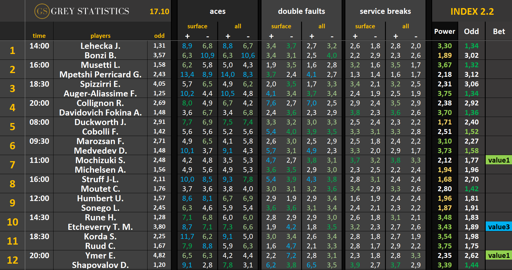 Bet – jeżeli kursy wystawione z pomocą indeksów są opłacalne względem kursów u bukmachera, w tej kolumnie pojawi się wartość “value” wraz z cyfrą (im wyższa, tym większe value)