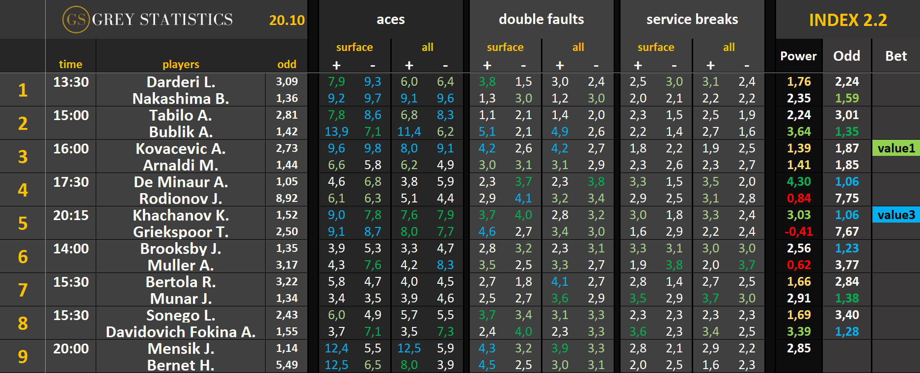 Bet – jeżeli kursy wystawione z pomocą indeksów są opłacalne względem kursów u bukmachera, w tej kolumnie pojawi się wartość “value” wraz z cyfrą (im wyższa, tym większe value)