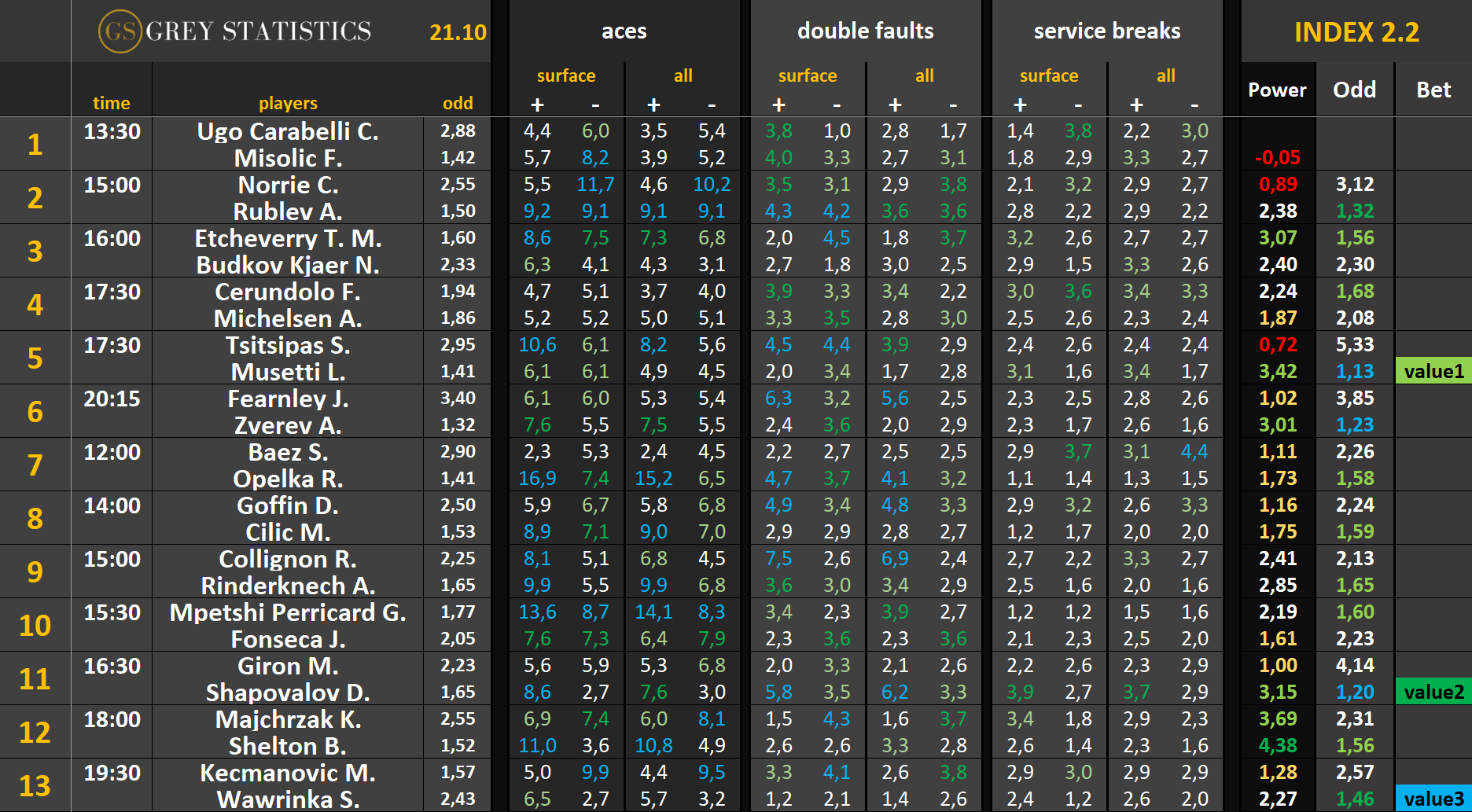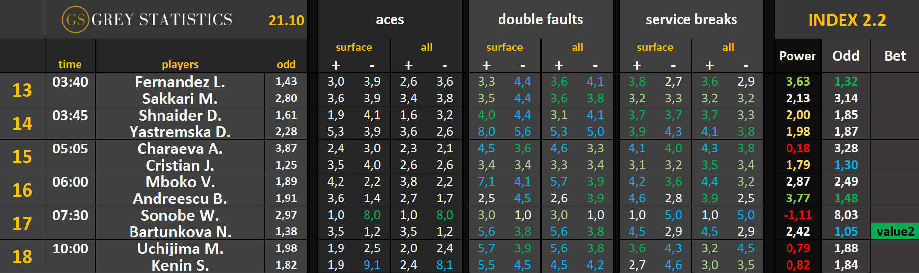 Bet – jeżeli kursy wystawione z pomocą indeksów są opłacalne względem kursów u bukmachera, w tej kolumnie pojawi się wartość “value” wraz z cyfrą (im wyższa, tym większe value)