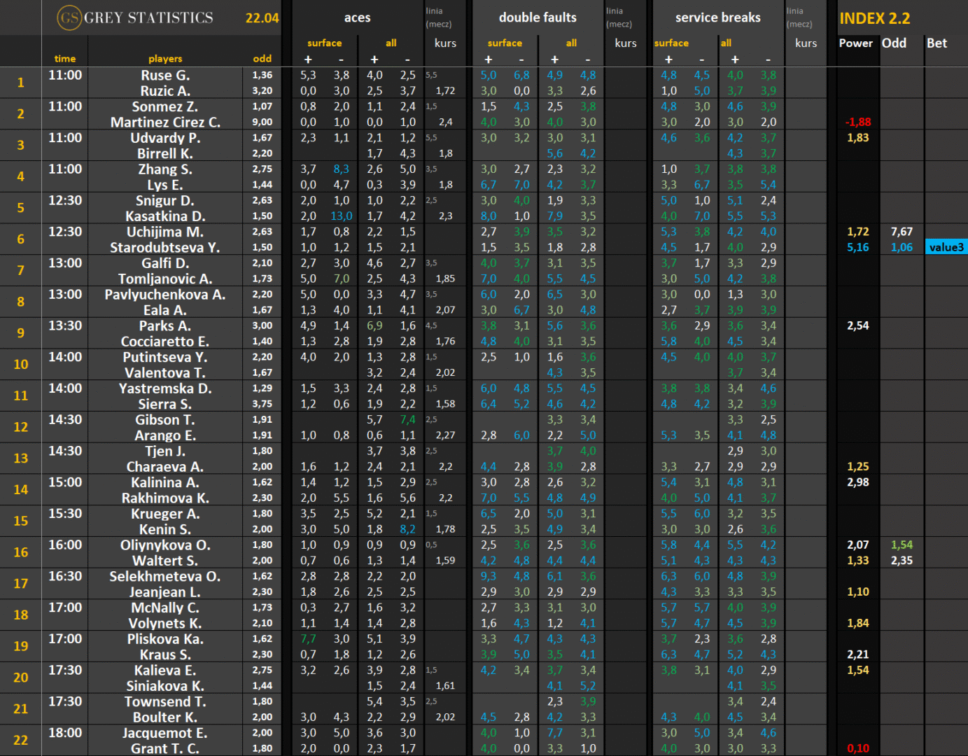 Zapraszamy na codzienną dawkę statystyk dotyczących asów serwisowych, podwójnych błędów i przełamań w spotkaniach ATP & WTA Tour autorstwa Grey Statistics. W tabelach znajdziecie średnie liczby z sezonu, które mogą pomóc w analizie i doborze typów na dany mecz.