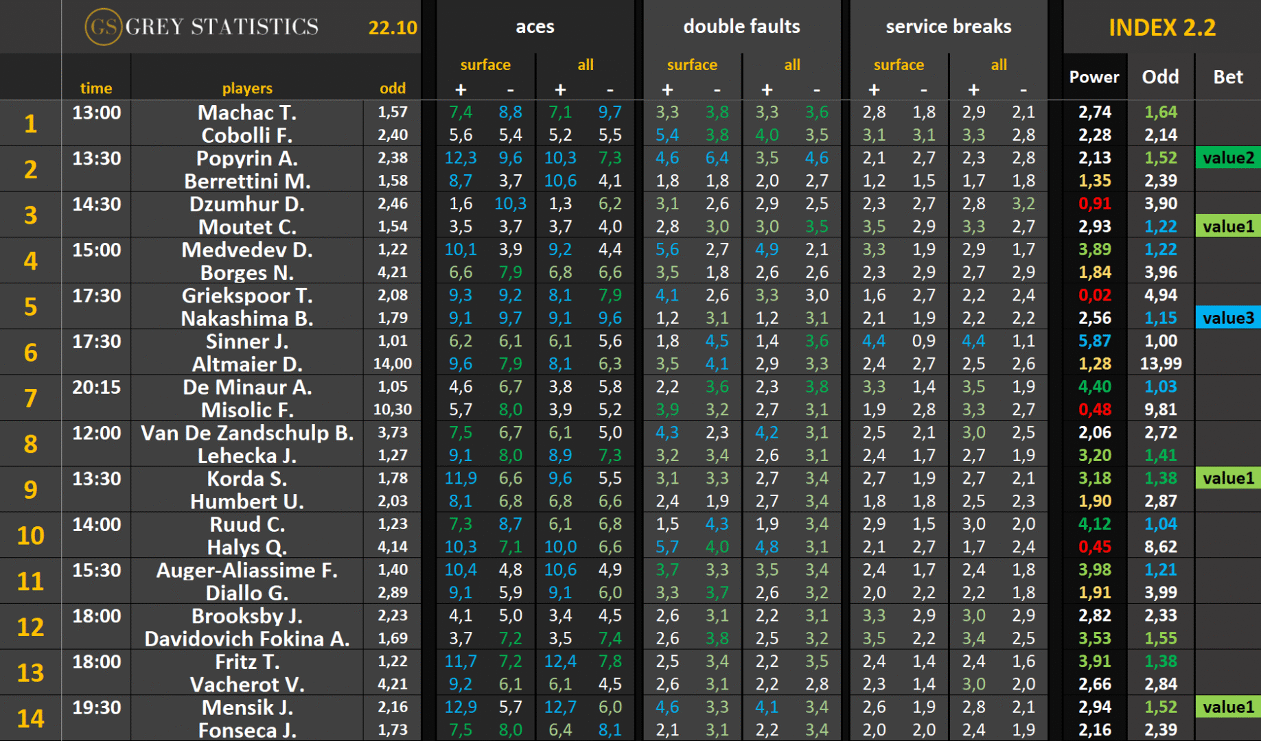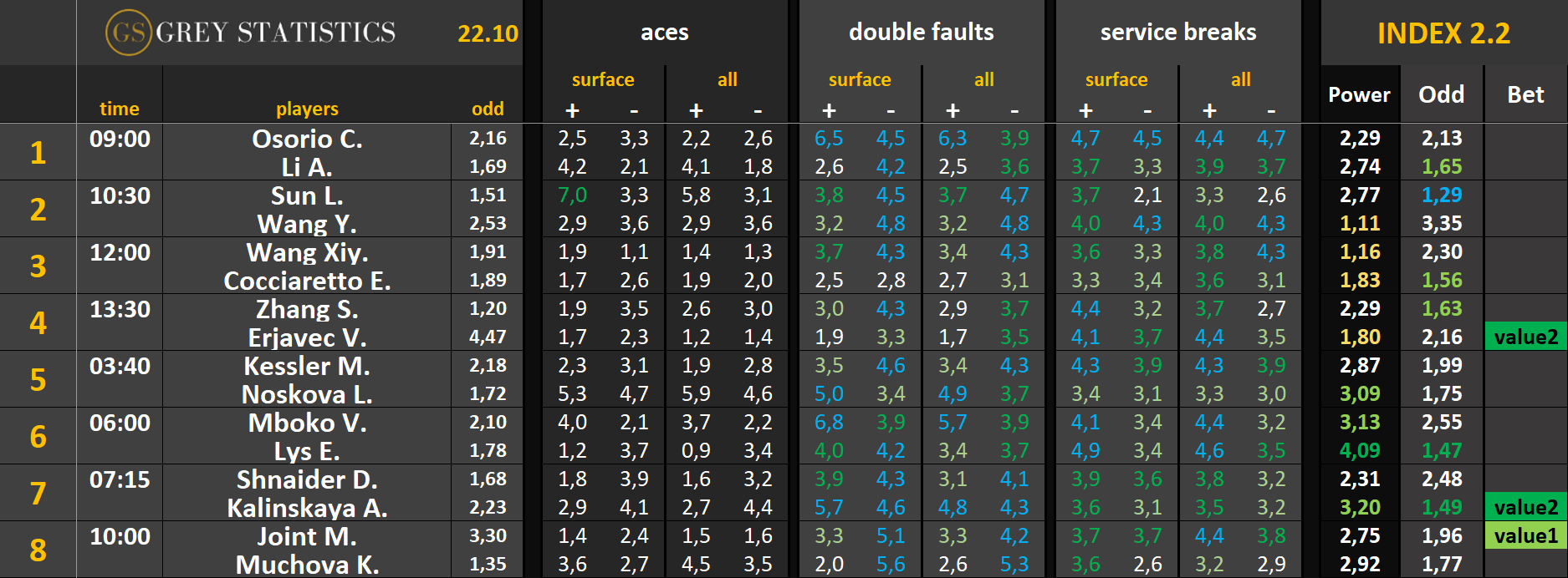 Bet – jeżeli kursy wystawione z pomocą indeksów są opłacalne względem kursów u bukmachera, w tej kolumnie pojawi się wartość “value” wraz z cyfrą (im wyższa, tym większe value)