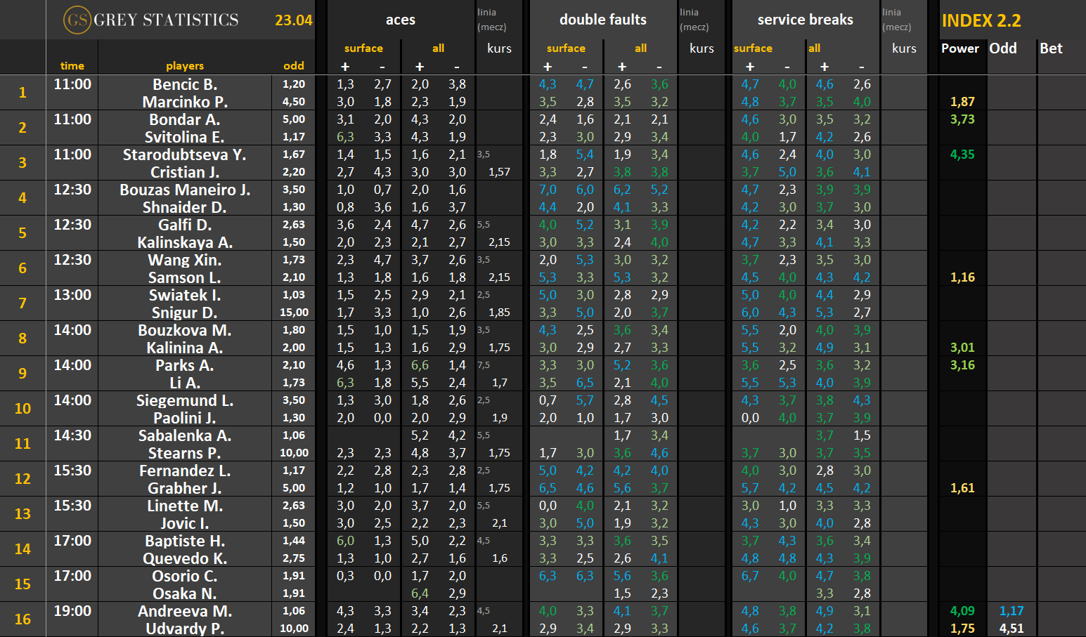 Zapraszamy na codzienną dawkę statystyk dotyczących asów serwisowych, podwójnych błędów i przełamań w spotkaniach ATP & WTA Tour autorstwa Grey Statistics. W tabelach znajdziecie średnie liczby z sezonu, które mogą pomóc w analizie i doborze typów na dany mecz.