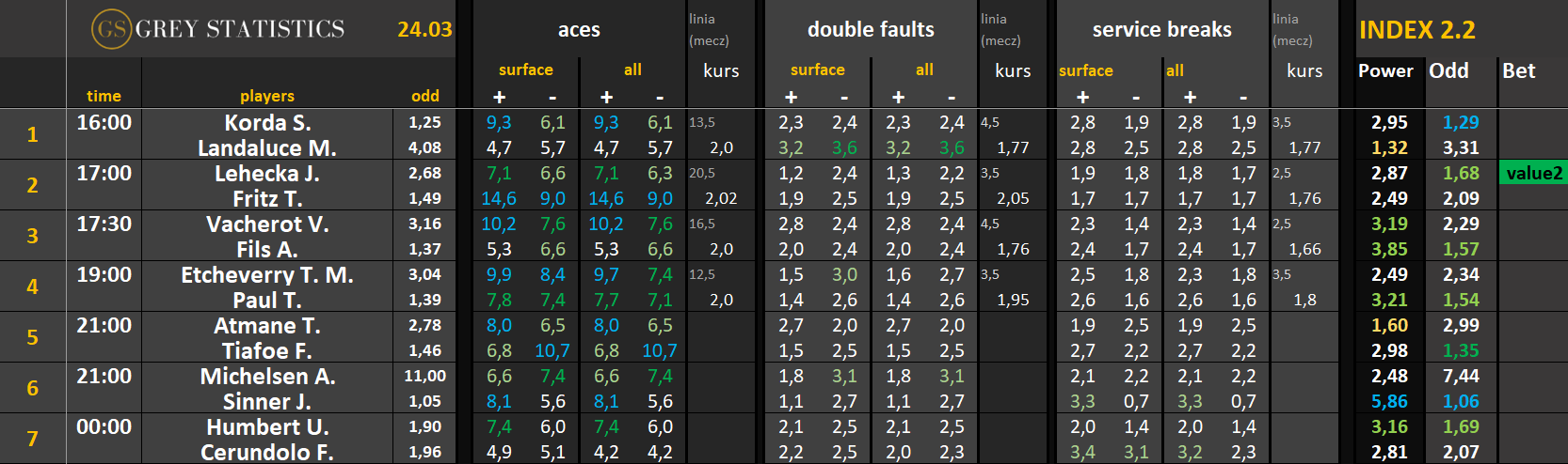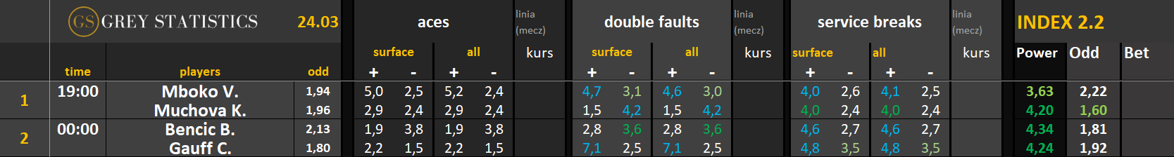 Zapraszamy na codzienną dawkę statystyk dotyczących asów serwisowych, podwójnych błędów i przełamań w spotkaniach ATP & WTA Tour autorstwa Grey Statistics. W tabelach znajdziecie średnie liczby z sezonu, które mogą pomóc w analizie i doborze typów na dany mecz.