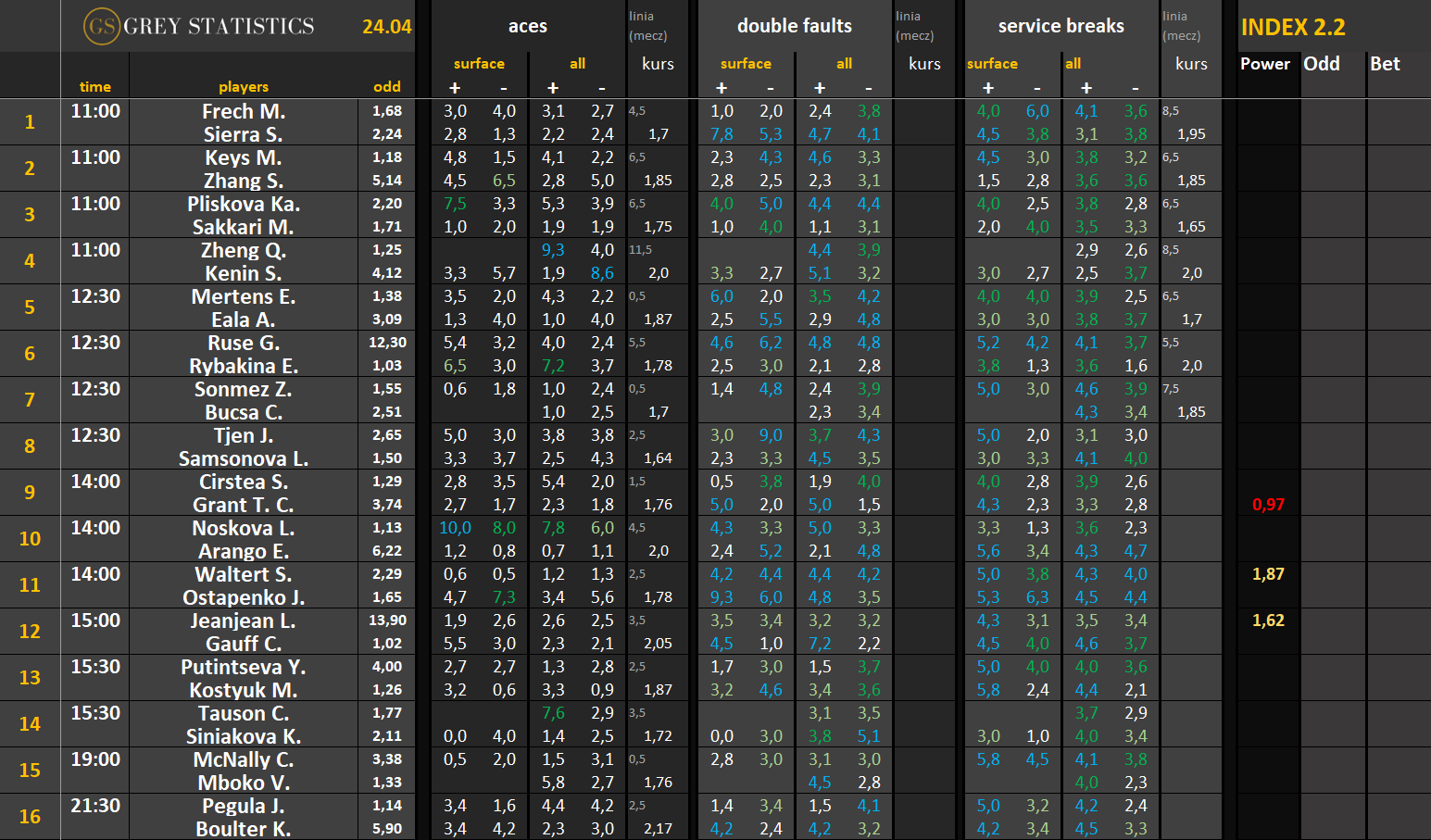 Zapraszamy na codzienną dawkę statystyk dotyczących asów serwisowych, podwójnych błędów i przełamań w spotkaniach ATP & WTA Tour autorstwa Grey Statistics. W tabelach znajdziecie średnie liczby z sezonu, które mogą pomóc w analizie i doborze typów na dany mecz.