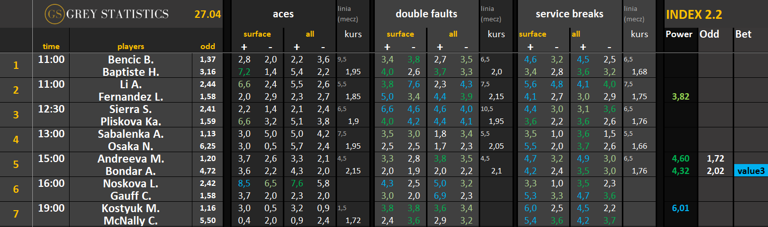 Zapraszamy na codzienną dawkę statystyk dotyczących asów serwisowych, podwójnych błędów i przełamań w spotkaniach ATP & WTA Tour autorstwa Grey Statistics. W tabelach znajdziecie średnie liczby z sezonu, które mogą pomóc w analizie i doborze typów na dany mecz.