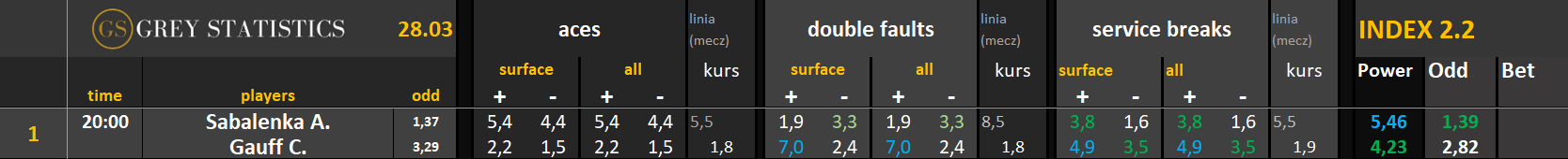 Zapraszamy na codzienną dawkę statystyk dotyczących asów serwisowych, podwójnych błędów i przełamań w spotkaniach ATP & WTA Tour autorstwa Grey Statistics. W tabelach znajdziecie średnie liczby z sezonu, które mogą pomóc w analizie i doborze typów na dany mecz.