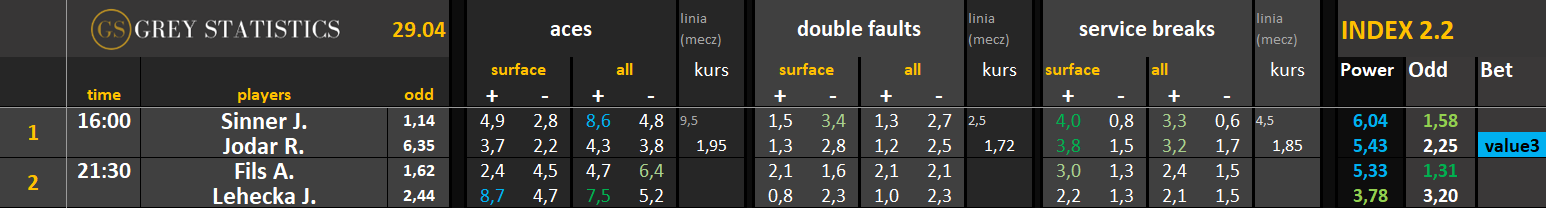 + średnia zdobytych asów/podwójnych błędów/przełamań serwisu