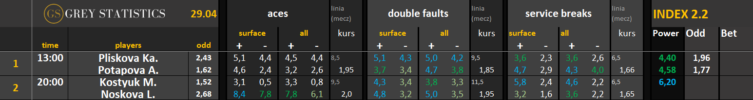 Zapraszamy na codzienną dawkę statystyk dotyczących asów serwisowych, podwójnych błędów i przełamań w spotkaniach ATP & WTA Tour autorstwa Grey Statistics. W tabelach znajdziecie średnie liczby z sezonu, które mogą pomóc w analizie i doborze typów na dany mecz.