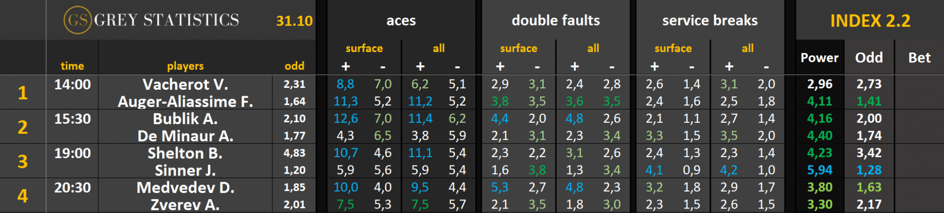 Zapraszamy na codzienną dawkę statystyk dotyczących asów serwisowych, podwójnych błędów i przełamań w spotkaniach ATP & WTA Tour autorstwa Grey Statistics. W tabelach znajdziecie średnie liczby z sezonu, które mogą pomóc w analizie i doborze typów na dany mecz.