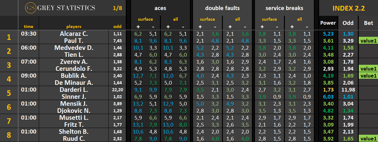 Zapraszamy na codzienną dawkę statystyk dotyczących asów serwisowych, podwójnych błędów i przełamań w spotkaniach ATP & WTA Tour autorstwa Grey Statistics. W tabelach znajdziecie średnie liczby z sezonu, które mogą pomóc w analizie i doborze typów na dany mecz.