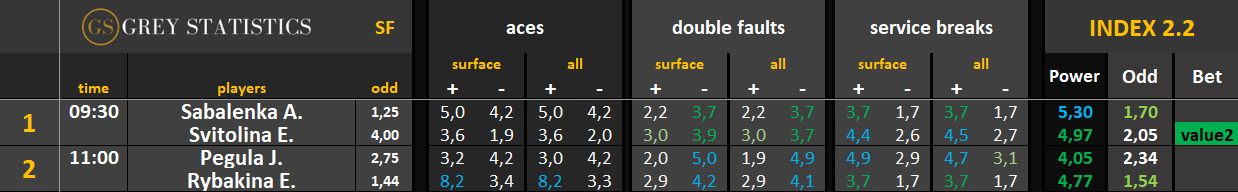 Zapraszamy na codzienną dawkę statystyk dotyczących asów serwisowych, podwójnych błędów i przełamań w spotkaniach ATP & WTA Tour autorstwa Grey Statistics. W tabelach znajdziecie średnie liczby z sezonu, które mogą pomóc w analizie i doborze typów na dany mecz.