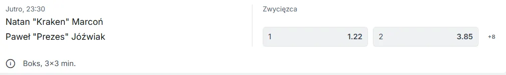 Według mnie walka potrwa pełny dystans, co powinno premiować „Krakena”, który – przynajmniej na papierze – będzie miał przewagę kondycyjną. Uważam, iż Marcoń zdoła wypunktować popularnego „Prezesa”, wygrywając ten pojedynek decyzją sędziów. TYP: Natan Marcoń przez decyzję sędziów.