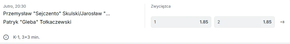 Przemysław „Sejczento” Skulski / Jarosław „Koziołek” Kozieł vs. Patryk „Gleba” Tołkaczewski – K-1, małe rękawice