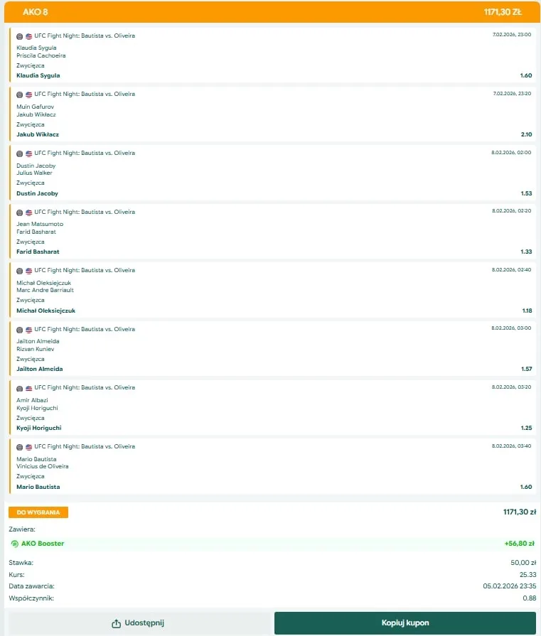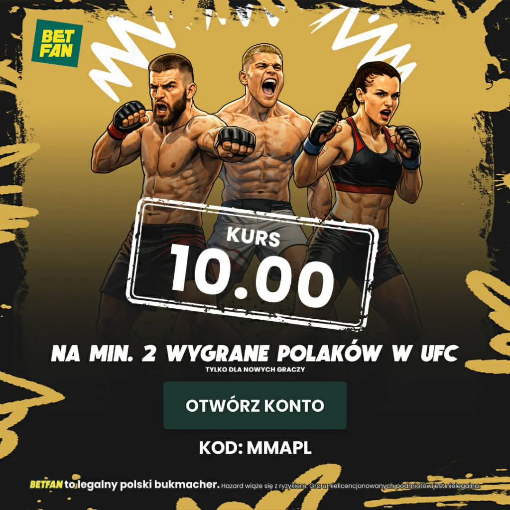 Nadchodząca gala UFC zapowiada się elektryzująco dla polskich fanów, bowiem w oktagonie zamelduje się aż trójka naszych reprezentantów: Syguła, Wikłacz i Oleksiejczuk! Zanim przejdziemy do naszych typów na te starcia, mamy dla Was prawdziwą „petardę” przygotowaną w ramach naszej współpracy z BETFAN. Tylko dla nowych graczy przygotowaliśmy specjalny powiększony kurs 10.00 na minimum 2 zwycięstwa Polaków. Jak skorzystać z tej okazji? Warunki są proste: rejestrujesz się z kodem MMAPL klikając TUTAJ, wpłacasz dokładnie 50 zł, aby przy okazji zgarnąć drugie 50 zł w bonusie powitalnym. Następnie stawiasz swój pierwszy kupon za dokładnie 20 zł na dedykowany zakład z kursem 10.00. jeżeli wygrają co najmniej dwie walki, na Twoje konto główne trafi aż 176 zł!