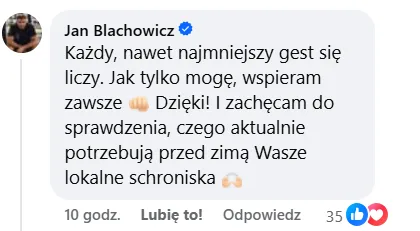 „Każdy, choćby najmniejszy gest się liczy. Jak tylko mogę, wspieram zawsze. Dzięki! I zachęcam do sprawdzenia, czego aktualnie potrzebują przed zimą Wasze lokalne schroniska”