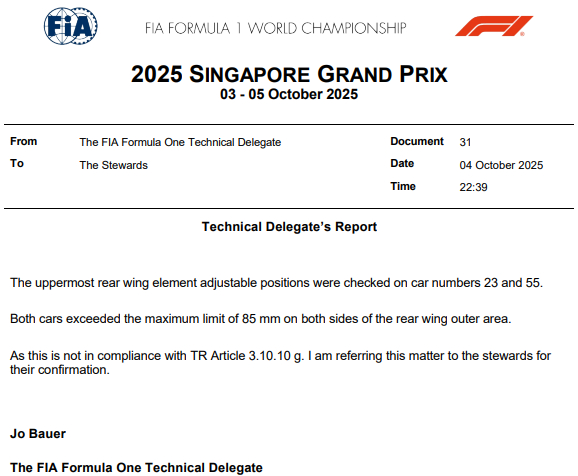 Delegat techniczny FIA zakwestionował legalność obu bolidów Williamsa podczas kwalifikacji do Grand Prix Singapuru i będą one zdyskwalifikowane.