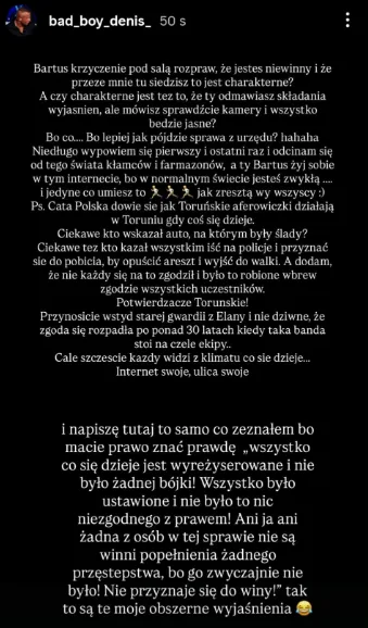 Mowa jest głównie właśnie o Denisie Załęckim, który wystosował dziś już dwa oświadczenia w tej sprawie. To drugie jest o tyle istotne, bowiem freak fighter podważa autentyczność niemalże wszystkich doniesień z ostatnich tygodni. Poniżej jego treść: