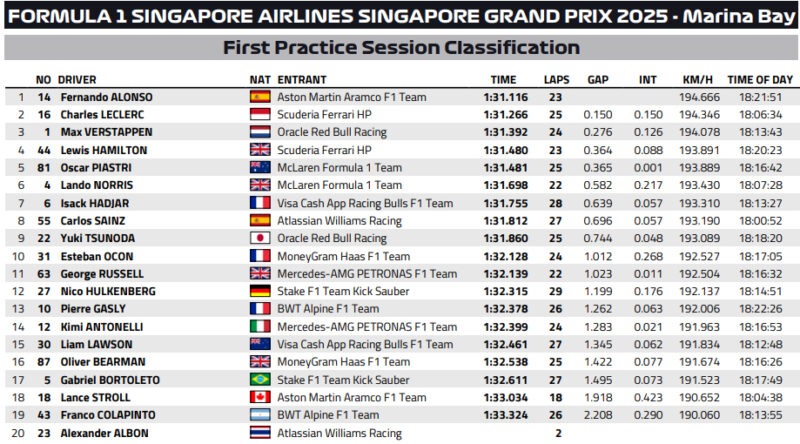 Poniżej zobaczycie wyniki wszystkich sesji weekendu wyścigowego Formuły 1 w ramach GP Singapuru. Kto był najszybszy?