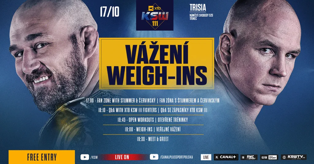 Federacja KSW zaprasza wszystkich fanów oraz media na oficjalną ceremonię ważenia oraz Strefę Fana przed galą XTB KSW 111 w Trzyńcu. Ważenie odbędzie się w piątek, 17 października o godzinie 19:00 w sali Trisia w Trzyńcu. Wstęp dla kibiców na ważenie jest wolny. Również w piątek o godzinie 17:00 wystartuje Strefa Fana otwarta dla wszystkich fanów KSW. Kibice mogą spodziewać się różnych atrakcji od KSW i partnerów organizacji oraz panelu Q&A z bohaterami gali, a o 18:45 odbędzie się krótki trening medialny. Po ważeniu kibice będą mieli okazję spotkać się z bohaterami sobotniej gali, zdobyć od nich autografy, zdjęcia i zamienić kilka słów.