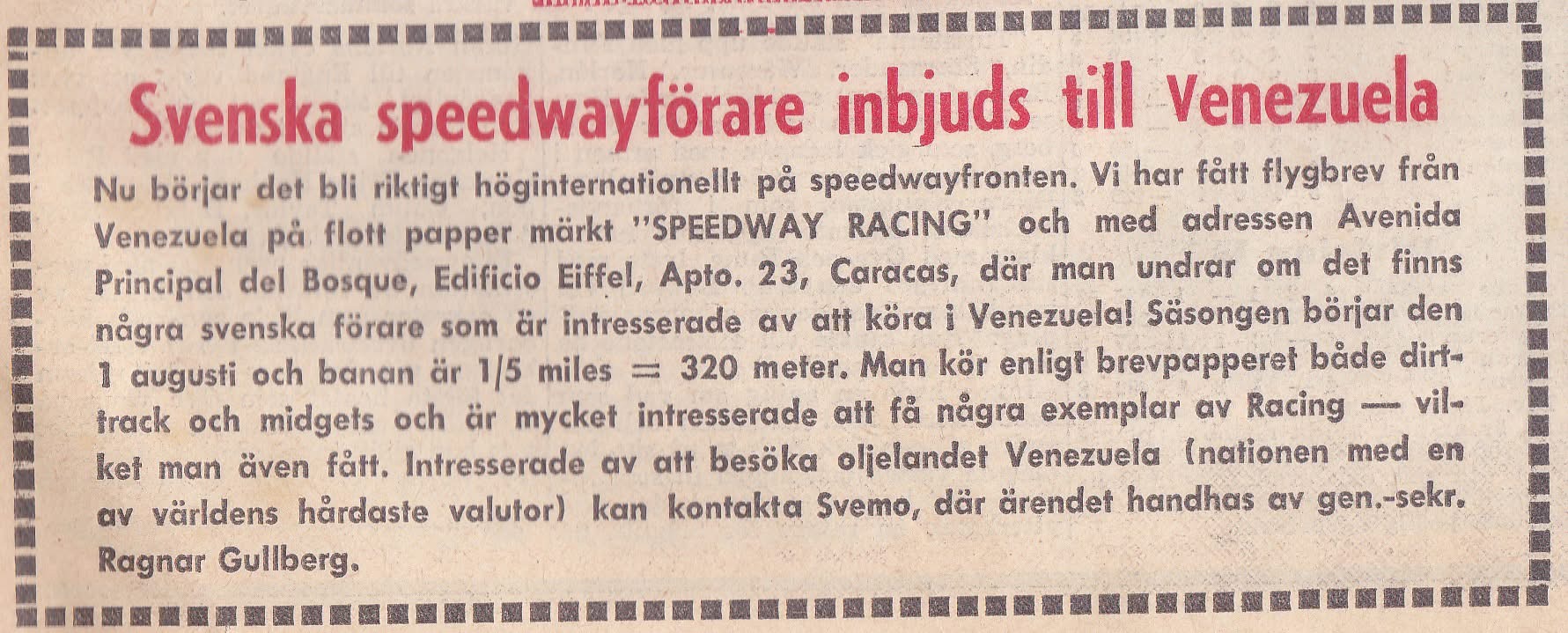 „Żużel staje się prawdziwie międzynarodowy. Drogą lotniczą otrzymaliśmy list z Wenezueli z adnotacją Speedway Racing oraz adresem zwrotnym: Avenida Principal del Bosque, Edificio Eiffel, Apto. 23. Zwrócono się do nas z pytaniem, czy w Szwecji są zawodnicy zainteresowani udziałem w zawodach w Wenezueli, które rozpoczną się 1 sierpnia i odbędą się na torze o długości 320 metrów… Wszystkich chętnych do odwiedzenia naftowej Wenezueli (kraju z jedną z „najsilniejszych” walut świata) prosimy o kontakt z SVEMO (Szwedzką Federacją Motocyklową)”.