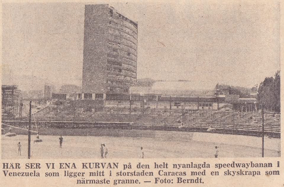 Oprócz tekstowych relacji, Berndt Nilsson wysyłał do redakcji Racing także niektóre swoje fotografie. Jedna z nich stała się dla mnie głównym punktem odniesienia przy ustalaniu lokalizacji Estadio Bello Monte. To właśnie dzięki budynkowi Centro Profesional del Este, o którym wspominałem na początku tego materiału, udało się najpierw odnaleźć dokładne miejsce, w którym w 1959 roku zbudowano pierwszy i jedyny w historii Wenezueli stadion żużlowy. Później trafiłem na zdjęcie, na którym wyraźnie widać żużlowy owal, co tylko potwierdziło trafność poszukiwań. Bez wątpienia stadion znajdował się właśnie tutaj. Na współczesnej mapie Caracas nie znajdziemy już choćby śladu tego faktu – w tej chwili teren jest gęsto zabudowany, a niegdyś okazały wieżowiec Centro Profesional del Este ginie wśród nowoczesnego architektonicznego chaosu. Historia Estadio Bello Monte była krótka, a choćby nieco absurdalna: trybuny, które nigdy nie doczekały się kompletu widzów, zaczęto rozbierać niemal miesiąc po ostatniej imprezie żużlowej pod koniec 1959 roku. Powodem była rozbudowa istniejącej drogi do bardziej nowoczesnej autostrady z większą liczbą pasów ruchu. Ciekawe, czy organizatorzy zawodów wiedzieli o tych planach, inwestując znaczne środki w budowę obiektu sportowego? A może liczyli na społeczny opór, który mógłby zmienić decyzję władz? Tak czy inaczej Estadio Bello Monte istniało jeszcze przez pewien czas choćby bez trybun – odbywały się tu wyścigi samochodowe, a później urządzono tor kartingowy, który ostatecznie również został zabudowany. Wróćmy jednak do grudnia 1959 roku, kiedy organizatorzy zawodów w Caracas głowili się nad tym, jak zdobyć serca lokalnej publiczności, a zagraniczni żużlowcy kontynuowali swoją latynoamerykańską przygodę, którą zapamiętają na całe życie. Czy można na przykład zapomnieć tę „wesołą” historię, o której w kolejnym liście do Racing opowiedział Berndt Nilsson?