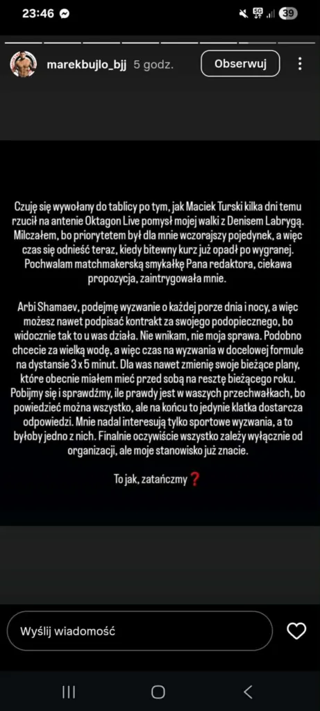 „Czuję się wywołany do tablicy po tym, jak Maciek Turski kilka dni temu rzucił na antenie Oktagon Live pomysł mojej walki z Denisem Labrygą.