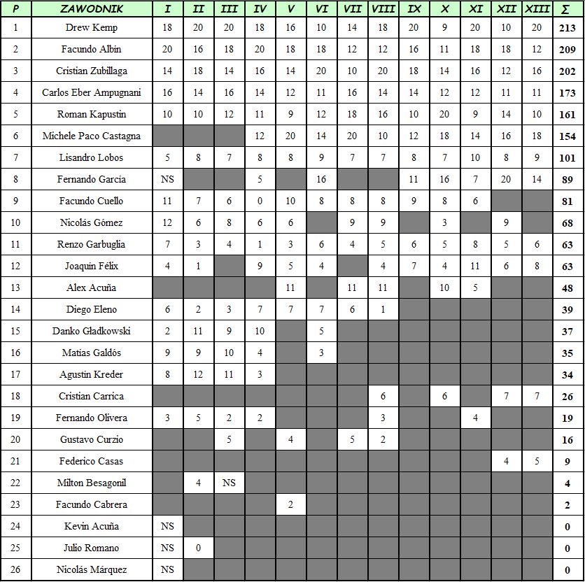 Podium zawodów uzupełnili Paco Castagna oraz Cristian Zubillaga. Ten ostatni wywalczył jednocześnie brązowy medal. Podsumowując cały cykl czempionatu w Ameryce Południowej – łącznie zgłoszonych było 26 zawodników, natomiast w minimum jednym biegu pojawiło się 24.