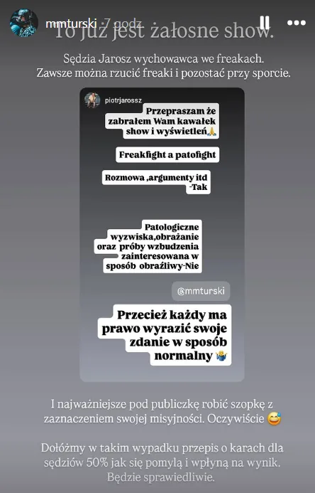 Przepraszam, iż zabrałem Wam kawałek show i wyświetleń. Freakfight, a patofight. Rozmowa, argumenty itd – Tak. Patologiczne wyzwiska, obrażanie oraz próby wzbudzenia zainteresowania w sposób obraźliwy – Nie. Przecież każdy ma prawo wyrazić swoje zdanie w sposób normalny.
