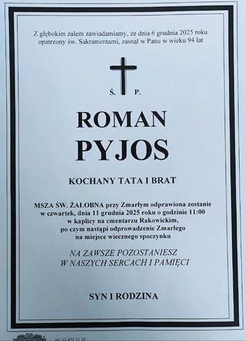Związek Piłki manualnej w Polsce z wielkim żalem zawiadamia, iż w dniu 6 grudnia 2025 roku w wieku 94 lat zmarł Roman Pyjos, były wielokrotny reprezentant Polski w piłce manualnej.
