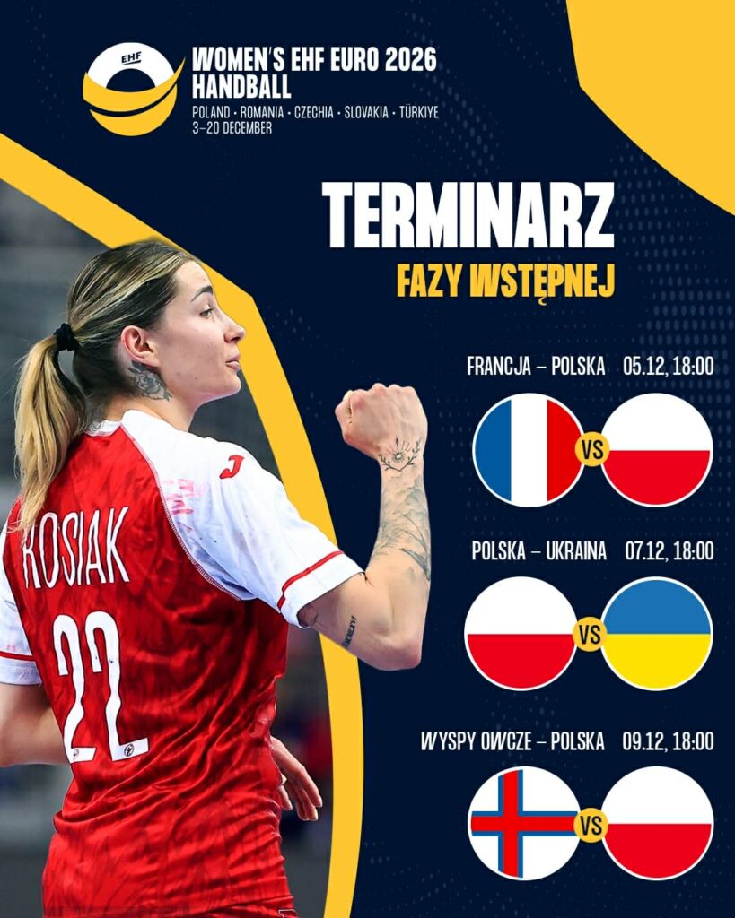 Reprezentacja Polski kobiet poznała dokładne terminy spotkań w ramach fazy grupowej Mistrzostw Europy Kobiet 2026, które pod koniec tego roku odbędą się m.in. w Polsce. Mecz otwarcia Biało-Czerwone rozegrają przeciwko Francji w sobotę 5 grudnia. Dwa dni później Polki zmierzą się z Ukrainą, a na zakończenie pierwszego etapu turnieju podejmą Wyspy Owcze. Wszystkie spotkania zaplanowano na godz. 18.00. Pakiet biletów na wszystkie grupowe mecze z udziałem naszych reprezentantek można kupić TUTAJ.