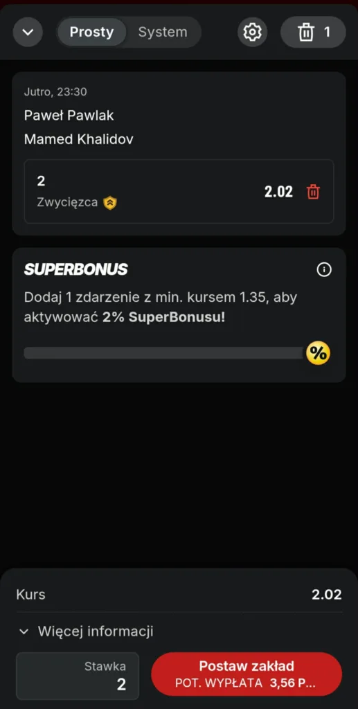 3. Dokonaj pierwszej wpłaty na konto gracza Superbet w wysokości co najmniej 50 PLN. Następnie postaw swój pierwszy kupon singiel z minimalną stawką 2 PLN, zawierający zakład na zwycięzcę dowolnej walki z oferty przedmeczowej gali KSW 117. Koniecznie pamiętaj, iż w promocji bierze udział wyłącznie pierwszy kupon zawarty po założeniu konta, który musi być kuponem typu singiel.