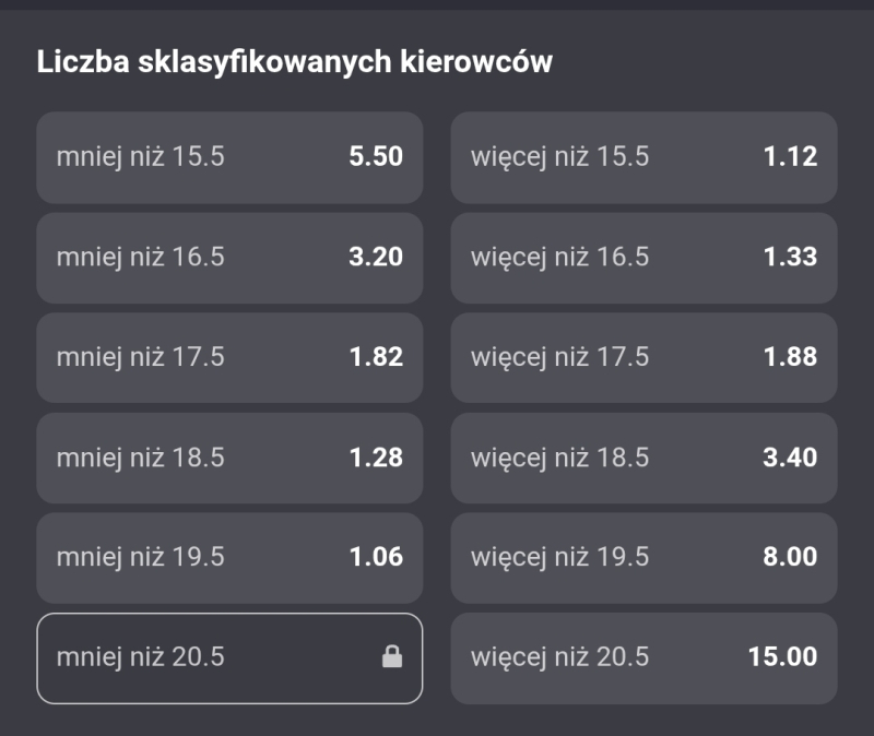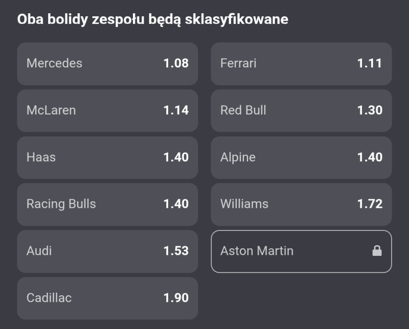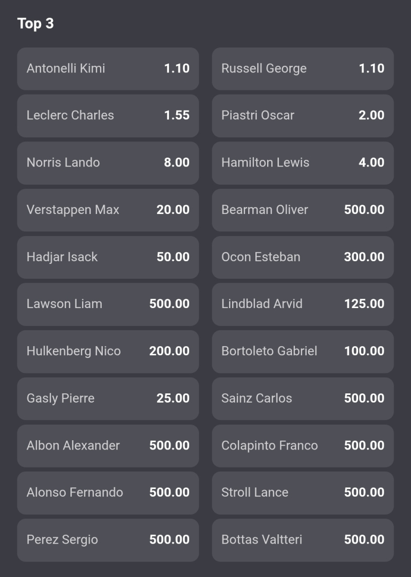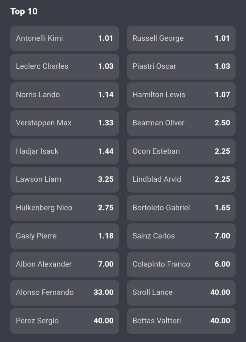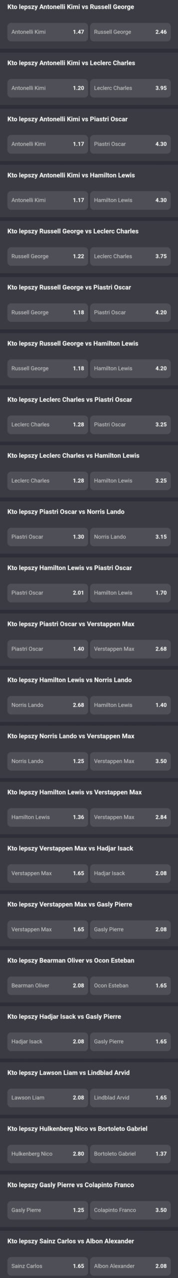 Według Fortuny dość wyraźnym faworytem rywalizacji jest Andrea Kimi Antonelli. Kurs na jego zwycięstwo to 1.55, a na George Russella 2.75. Żaden inny kierowca raczej nie ma szans na triumf (kliknięcie w grafikę przenosi do strony z kursami).