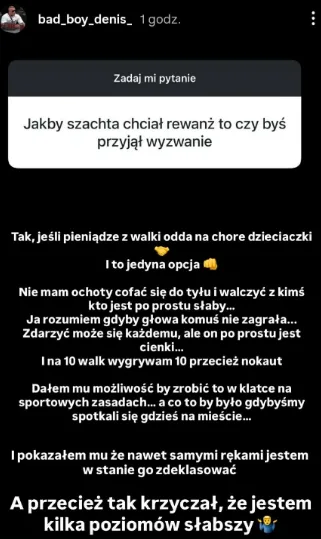 Jeśli pieniądze z walki odda na chore dzieci i to jedyna opcja. Nie mam ochoty cofać się i walczyć z kimś, kto jest po prostu słaby. Ja rozumiem, gdyby głowa komuś nie zagrała, zdarzyć może się każdemu, ale on po prostu jest cienki. I na dziesięć walk wygrywam dziesięć, przecież nokaut. Dałem mu możliwość, by zrobić to w klatce na sportowych zasadach, a co to by było, gdybyśmy spotkali się gdzieś na mieście. I pokazałem mu, iż choćby samymi rękami jestem w stanie go zdeklasować. A przecież tak krzyczał, iż jestem kilka poziomów słabszy.