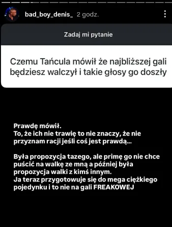 Prawdę mówi. To, iż ich nie trawię, to nie znaczy, iż nie przyznam racji, jeżeli coś jest prawdą. Była propozycja Taazy’ego, ale PRIME go nie chce puścić na walkę ze mną, a później była propozycja walki z kimś innym. Ja teraz przygotowuję się do mega ciężkiego pojedynku i to nie na gali freakowej.