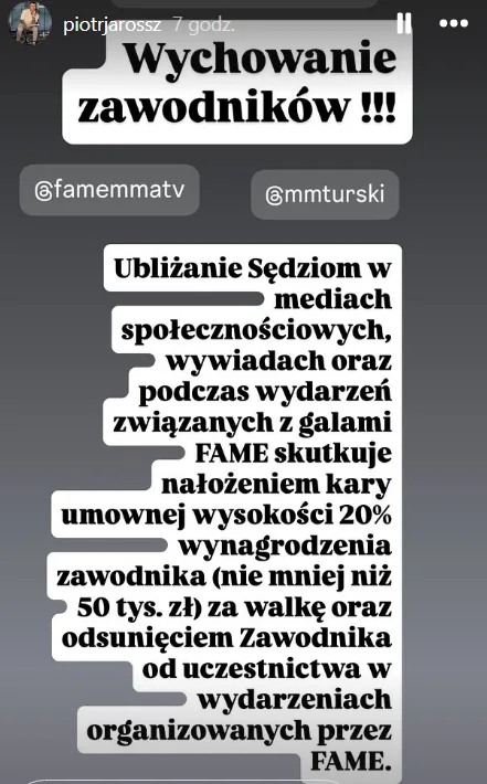 Ubliżanie Sędziom w mediach społecznościowych, wywiadach oraz podczas wydarzeń związanych z galami FAME skutkuje nałożeniem kary umownej wysokości 20% wynagrodzenia zawodnika (nie mniej niż 50 tys. zł) za walkę oraz odsunięciem Zawodnika od uczestnictwa w wydarzeniach organizowanych przez FAME.