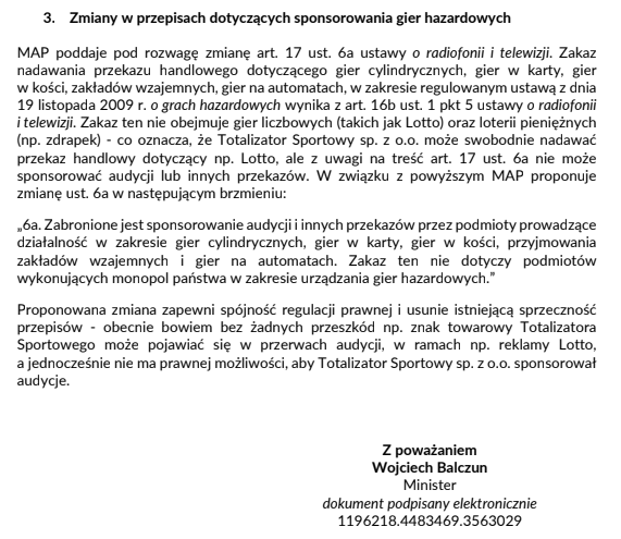 Do przepisu ma zostać dodane zdanie: „Zakaz ten nie dotyczy podmiotów wykonujących monopol państwa w zakresie urządzania gier hazardowych” . Taka modyfikacja przepisów ma na celu zapewnienie spójności regulacji prawnej i usunięcie istniejącej sprzeczności. jeżeli propozycja wejdzie w życie w sugerowanym kształcie, otworzy to przed operatorem monopolu państwowego zupełnie nowe możliwości w zakresie inżynierii finansowej mediów i budowania świadomości marki.