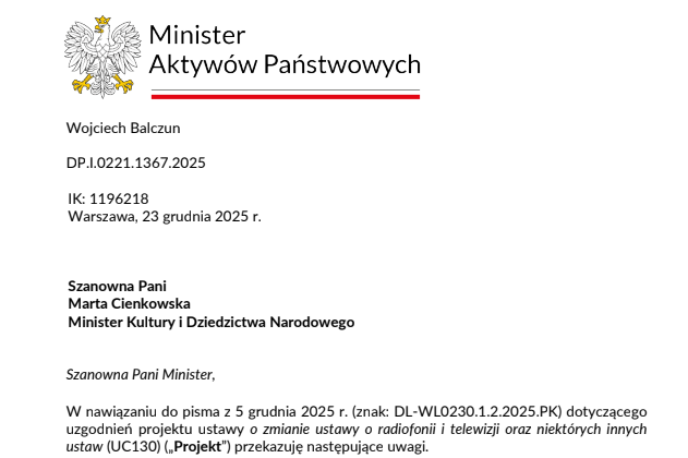 W oficjalnym piśmie skierowanym do Ministerstwa Kultury i Dziedzictwa Narodowego, resort nadzorujący spółki skarbu państwa zwrócił uwagę na konieczność nowelizacji w trzech zakresach: