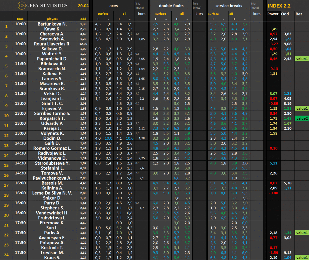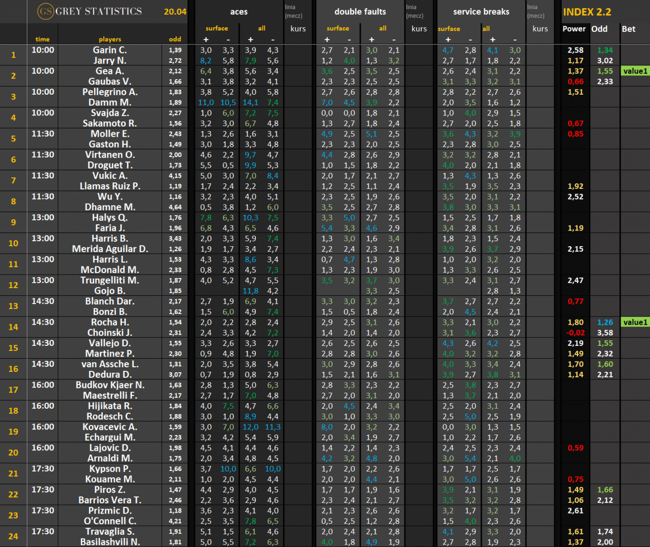 Zapraszamy na codzienną dawkę statystyk dotyczących asów serwisowych, podwójnych błędów i przełamań w spotkaniach ATP & WTA Tour autorstwa Grey Statistics. W tabelach znajdziecie średnie liczby z sezonu, które mogą pomóc w analizie i doborze typów na dany mecz.